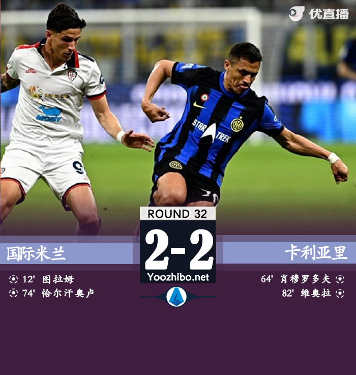 JRS直播网讯:北京时间4月15日,意甲第32轮,国米主场迎战卡利亚里。上半场,桑切斯助攻图拉姆先拔头筹,巴雷拉头球吊射破门越位在先被吹。易边再战,肖穆罗多夫破门,恰尔汗奥卢点射再次超出比分,维奥拉再次帮助客队扳平,拉帕杜拉手球助攻引争议。最终国米2-2卡利亚里。积分榜方面,国米26轮不败14分领跑,卡利亚里31分第14。