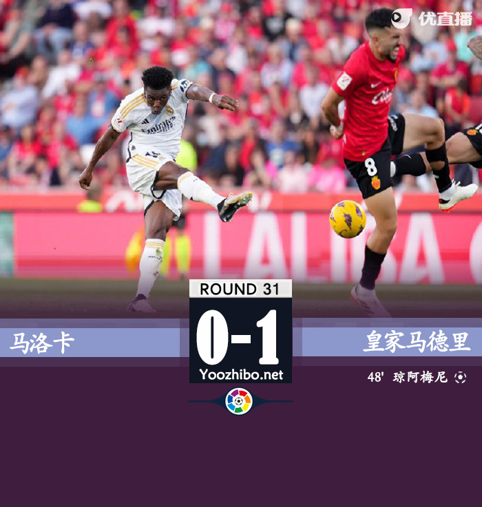 JRS直播网讯:北京时间4月14日,西甲联赛第31轮,马略卡队主场迎战皇家马德里队。上半场,赖洛头球攻门被卢宁扑出,贝林厄姆远射击中门框。下半场,楚阿梅尼世界波破门,卜拉欣-迪亚斯抽射被扑,最终,皇马客场1-0马略卡迎联赛4连胜。