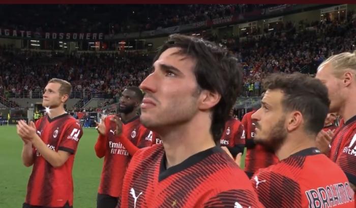 在数万米兰球迷的掌声致敬中,即便是铁骨铮铮的硬汉伊布也流下热泪。而主帅和米兰队友们,也都眼眶湿润充满不舍,意大利国脚托纳利更是哭到颤抖。马尔蒂尼代表米兰,为伊布颁发了一件印有他红黑军团11号球衣的纪念牌。