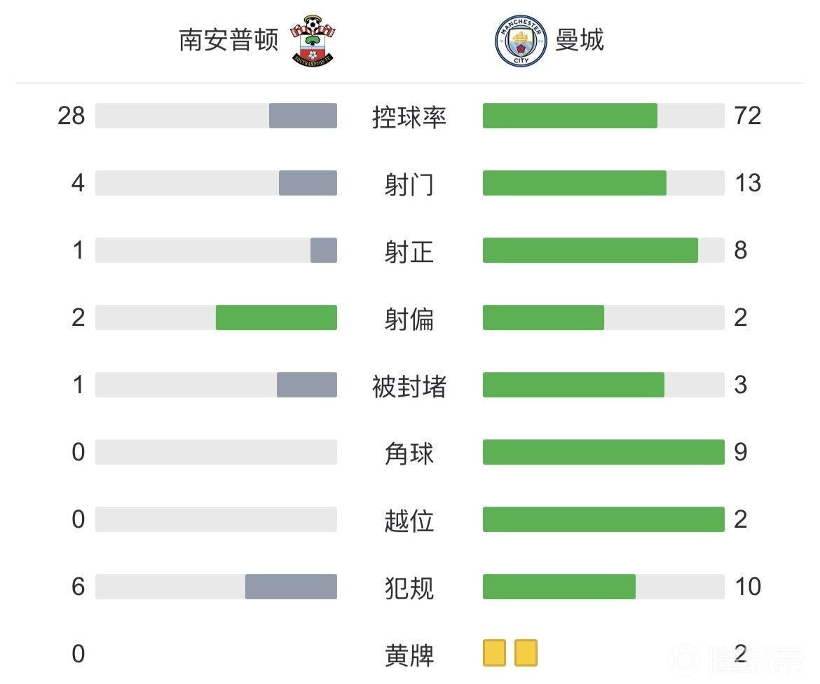 最终曼城客场4-1战胜南安普顿,蓝月亮取得联赛五连胜。
