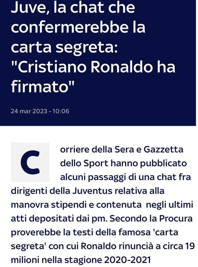 JRS直播网讯03月25日凌晨,来自《晚邮报》和《共和报》等多家意大利知名媒体的报道,关于尤文财务造假案件的调查,又出现了一个新的有力证据。一份被曝光的聊天记录证实,尤文管理层内部曾经讨论过C罗等球员,接受私下协议的事宜,并且确认C罗在合同上签下了名字。