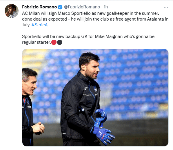 罗马诺写道:“AC米兰将在夏天签下马可·斯波蒂耶洛作为新门将,他将于7月从亚特兰大以自由球员的身份加盟AC米兰。斯波蒂耶洛将成为迈克·迈尼昂的新替补,迈克·迈尼昂是AC米兰一号门将。”