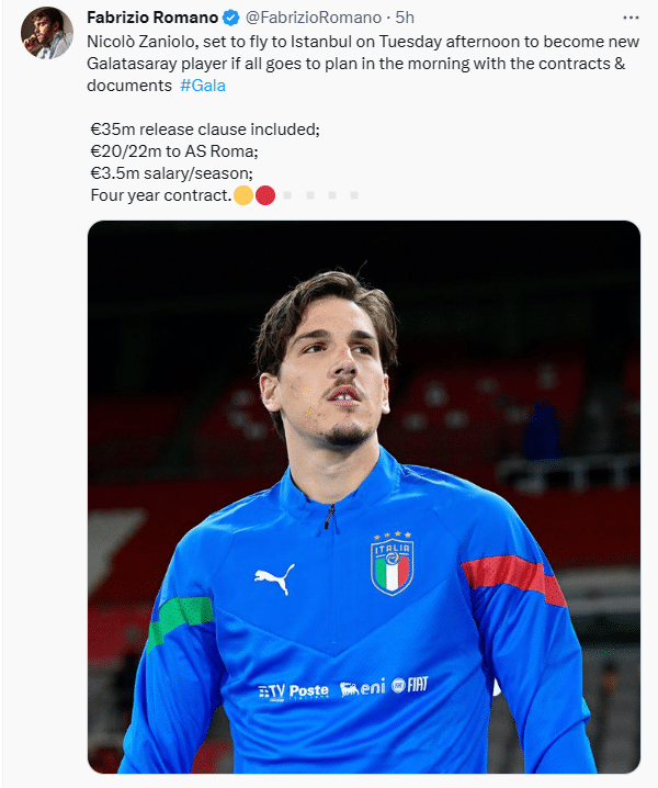 罗马诺写道:“尼科洛·扎尼奥洛将于周二下午飞往伊斯坦布尔,加盟加拉塔萨雷。如果一切顺利的话早上即可签下相关合同。”