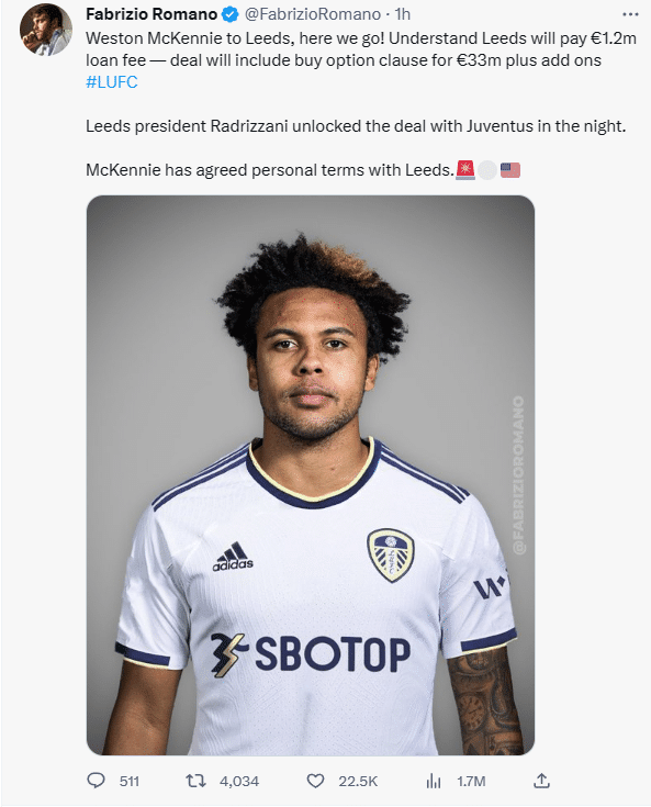 JRS直播网01月29日讯 据知名转会记者罗马诺的消息,利兹联租借尤文球员韦斯顿·麦肯尼。