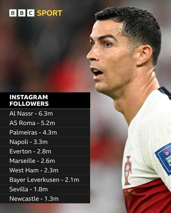 JRS直播网01月03日讯 BBC统计表明,利雅得胜利的Instagram粉丝数在签下C罗后暴涨。