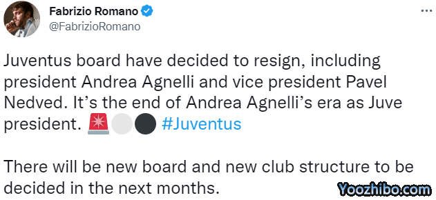 JRS直播网11月28日据罗马诺、斯基拉等多位记者以及多家媒体报道,尤文图斯董事会已经决定集体辞职。