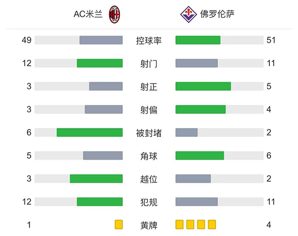 全场比赛结束,最终米兰2-1绝杀佛罗伦萨。