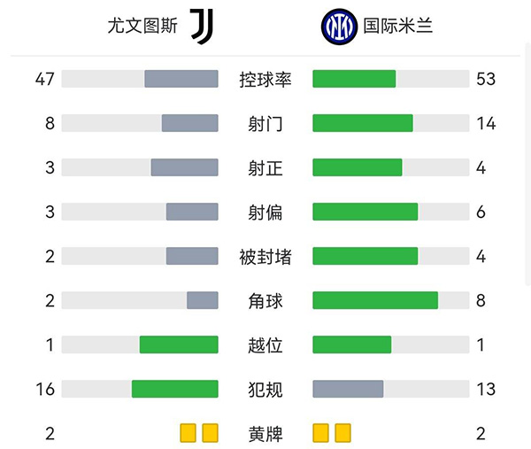 全场比赛结束,尤文图斯主场2-0击败国际米兰。