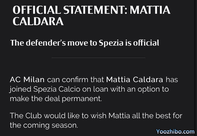 JRS直播网07月18日讯 AC米兰官方消息,球队后卫卡尔达拉租借加盟斯佩齐亚,租期一年。