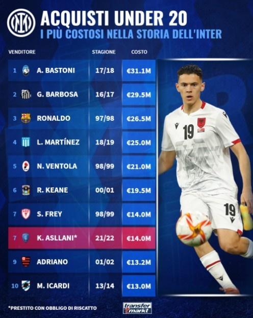 JRS直播网07月01日讯 今日,德转网站对国米队史引进的U20球员转会费进行了排序,巴斯托尼是3110万欧元最贵,大罗2650万欧元排名第三,阿斯拉尼排名第7名。