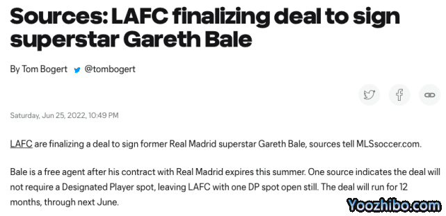 JRS直播网06月26日讯 晚,来自美职联记者Tom Bogert的最新消息,美职联劲旅洛杉矶FC即将敲定威尔士巨星贝尔,这则消息也得到了TA名记奥恩斯坦和转会专家罗马诺的确认。