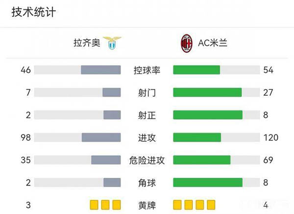 全场比赛结束,AC米兰客场2-1逆转拉齐奥。