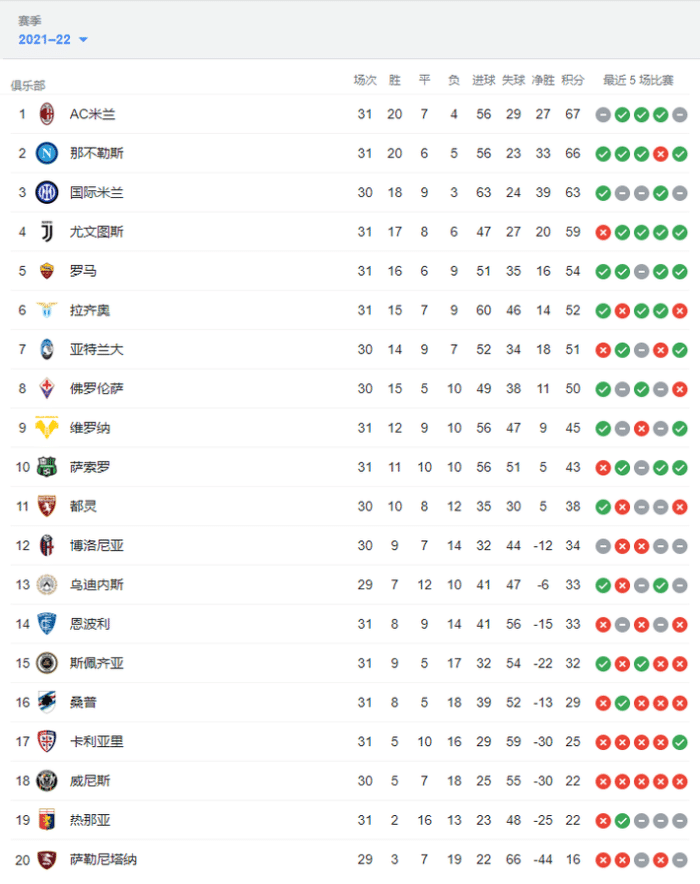 AC米兰平局后31轮积67分,以1分优势领跑积分榜,那不勒斯31轮66分紧随其后,国米在1-0击败死敌尤文后少赛一轮积63分,排名第三,尤文图斯则31轮59分排名第四。