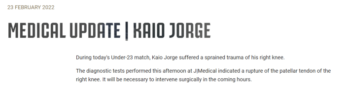 JRS直播网02月24日讯 据尤文图斯官方消息,球队新援凯奥-若热右膝髌腱断裂将接受手术治疗,根据跟队记者消息,球员赛季报销,预计缺阵半年。