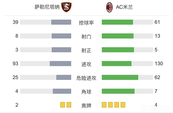 第5分钟,米兰组织攻势,特奥斜向内切后送出一脚直塞,梅西亚斯跟进左脚推射,塞佩判断错了方向,AC米兰1-0萨勒尼塔纳。