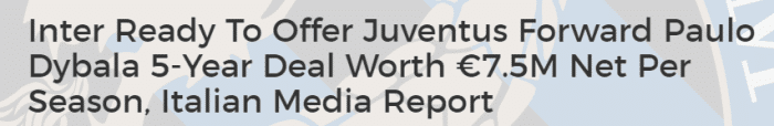 JRS直播网01月18日讯 消息,《米兰体育报》称国米已经告知迪巴拉,愿意为他开出年薪750万欧的5年合同。