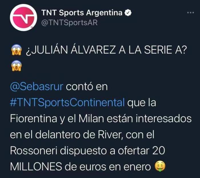 该记者表示,AC米兰与佛罗伦萨对这位只有21岁的年轻前锋感兴趣,而米兰愿意为阿尔瓦雷斯送上2000万欧元的报价。