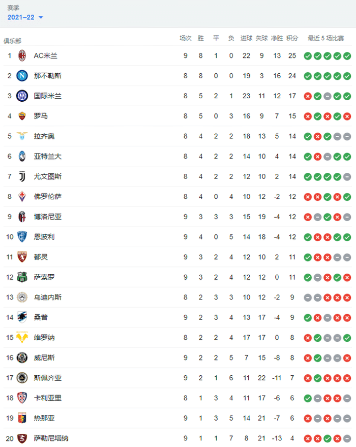 AC米兰9轮8胜1平保持不败,多赛一轮25分高居榜首,那不勒斯8轮全胜,落后米兰1分排名第二,国际米兰则8轮5胜2平1负,积17分排名第三。