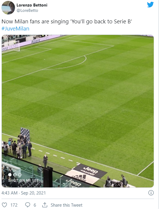 JRS直播网9月20日讯 据FootballItalia记者洛伦佐-贝托尼报道,在尤文vs米兰的比赛后,米兰球迷唱歌嘲讽对手,称尤文就要降级了。