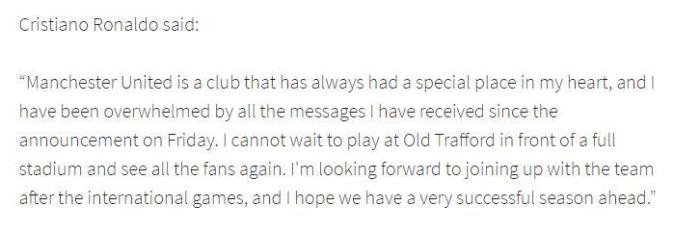 C罗说:“曼联是一家在我心中一直占据特殊位置的俱乐部,自从周五宣布我回到曼联以来,我收到许多问候,这让我很感动。”