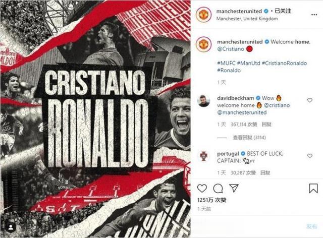 C罗上周末离开尤文图斯,回归曼联,红魔官宣他回归的INS状态创造了体育俱乐部点赞次数新纪录(超1250万)。