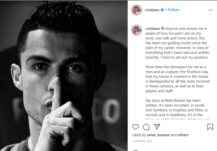 JRS直播网8月18日讯 最近媒体盛传C罗想要离开尤文图斯,并且有消息称他把自己推荐到了曼城,另外也有报道表示C罗想要回皇马。对此,C罗表示:“认识我的人都知道我很专注于自己的工作,少说多做是我一直信奉的格言,但由于最近出现很多关于我的新闻,我必须阐明自己的立场。”