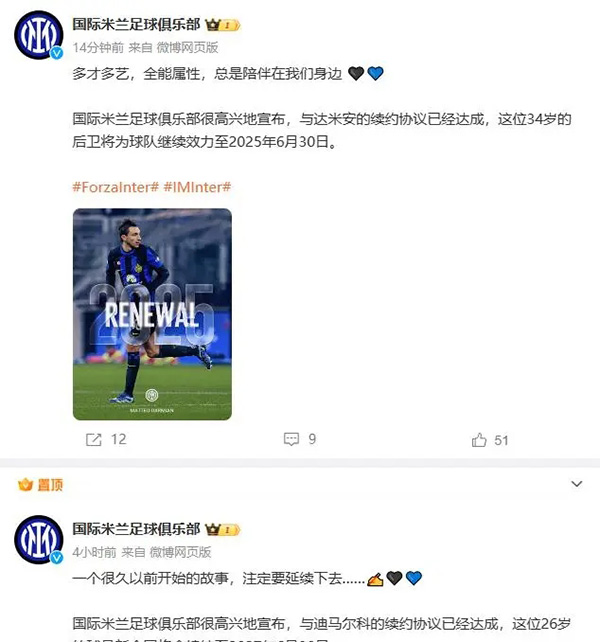 JRS直播网12月31日讯 ,国际米兰足球俱乐部官方宣布,分别与达米安、迪马尔科续约至2025年和2027年6月30日。