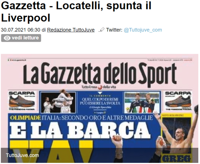 JRS直播网讯 据《米兰体育报》头版消息,利物浦已经加入到了萨索洛中场洛卡特利的争夺战当中,他们企图截胡尤文图斯。