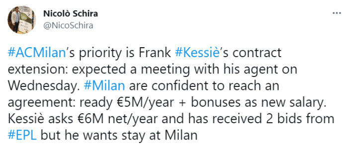 AC米兰的首要任务就是和凯西续约,他们预计当地时间周三与凯西的经纪人会面。米兰有信心与凯西完成续约,他们准备了500万欧年薪+奖金的合同。