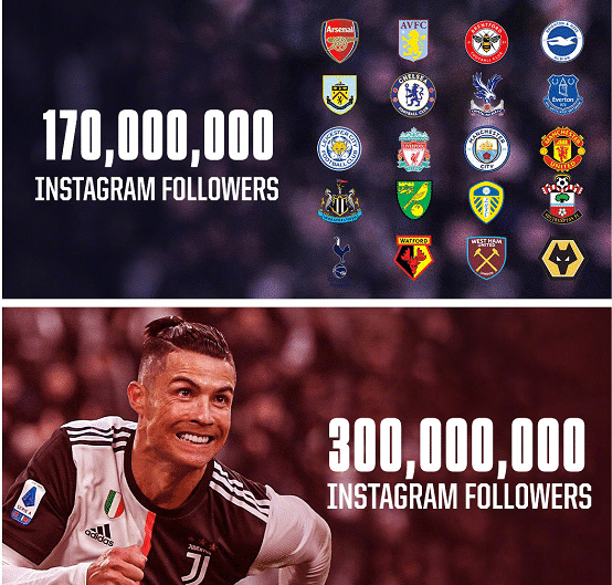 近日,ESPN进行了一个数据统计,全球INS粉丝最多的联赛是英超联赛,而英超二十支球队的粉丝加起来只有1.7亿人,比C罗的粉丝数少了1.3亿。而英超粉丝最多的俱乐部是曼联,他们在INS上的粉丝只有3300万,随后的利物浦、曼城和切尔西都在2000万左右。阿森纳和热刺都是一千多万,他们都和C罗的差距是巨大的,可见C罗的影响力有多大,有多少人关注他。