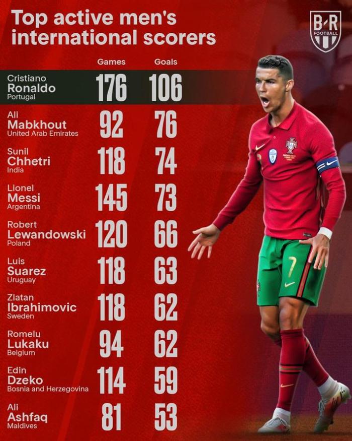 JRS直播网讯 露天看台今日统计了现役国家队射手榜,C罗106球遥遥领先。