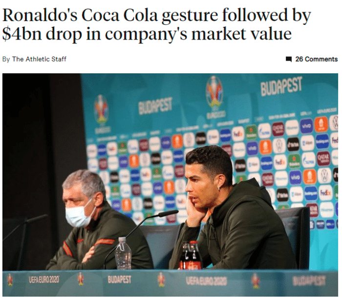 C罗在昨天的新闻发布会上挪走了面前桌子上的可口可乐,并举起矿泉水,示意自己只喝水。C罗这一个动作就导致可口可乐股价下跌,市值蒸发40亿美元。
