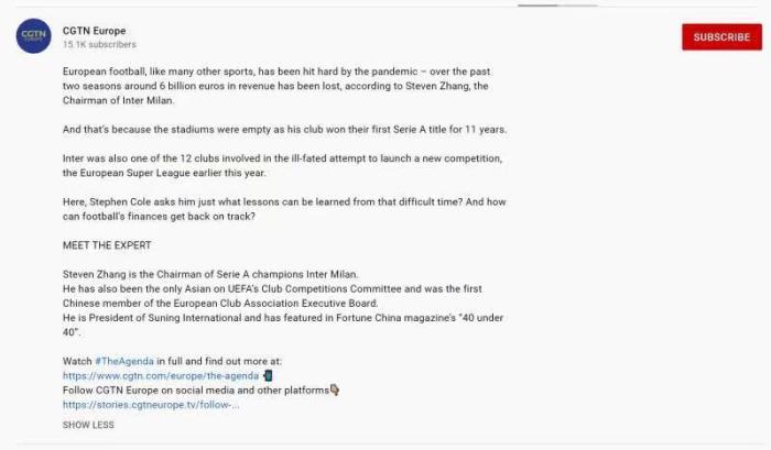 JRS直播网讯 近日,国际米兰主席张康阳接受了CGTN电视台The Agenda栏目的采访,在采访中他谈到了疫情对于足球产业带来的冲击。他认为疫情的爆发让所有俱乐部意识到他们必须要选择创新与改革,要为不同文化背景、不同年龄群体的球迷提供更多元、更有趣的内容。
