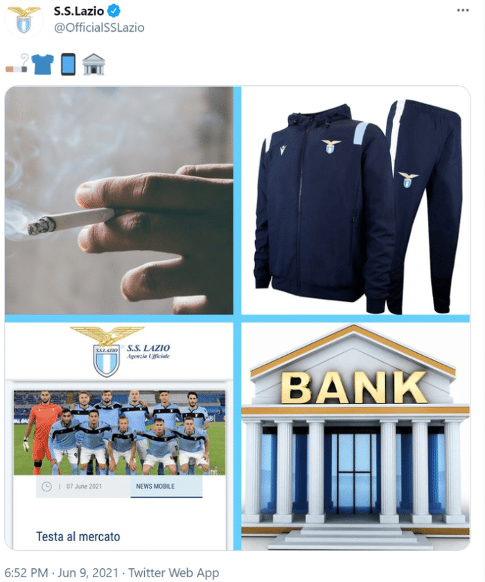 JRS直播网讯这张图片中有一根燃烧的香烟,一套拉齐奥的运动服,一张球队合照和一个写有“银行”的卡通建筑。