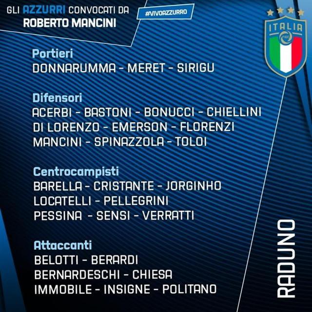 中场:巴雷拉(国米)、克里斯坦特(罗马)、若日尼奥(切尔西)、洛卡特利(萨索洛)、洛伦佐-佩莱格里尼(罗马)、佩西纳(亚特兰大)、森西(国米)、维拉蒂(巴黎)