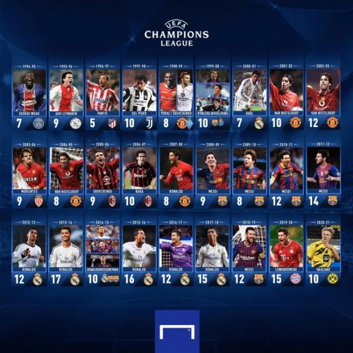 近日,《进球网》盘点了最近27年来,每个赛季的欧冠金靴94-95赛季是打进七球的维阿,95-96赛季是打进9球利特马宁,随后的赛季是打进5球的潘蒂奇,97-98赛季是打进10球的皮耶罗,98-99赛季是打进8球的约克和舍普琴科,99-00赛季是打进10球的劳尔、里瓦尔多和贾德尔,00-01赛季是打进7球的劳尔,01-02赛季和02-03赛季都说范尼,他分别打进10球和12球。03-04赛季是打进9球的莫伦特斯,04-05赛季是8球的范尼,随后的赛季是9球的舍普琴科,跟着06-07赛季是10球的卡卡,07-08赛季是8球的C罗。08-09赛季开始一直到11-12赛季,梅西完成了四连冠,分别打进9球、8球、12球和14球。而12-13赛季开始到17-18赛季C罗完成了六连冠分别打进12球、17球、10球、16球、12球和15球。其中14-15赛季梅西和内马尔和C罗并列金靴都是10球。而18-19赛季梅西打进12球斩获金靴,上赛季莱万打进15球斩获金靴,本赛季就是哈兰德的10球了。