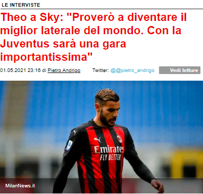 JRS直播网讯北京时间5月2日,意甲联赛第34轮中,AC米兰主场2-0战胜了贝内文托,来到了积分榜第二名。特奥的进球帮球队扩大了领先优势。赛后,特奥接受了意大利天空体育的采访。