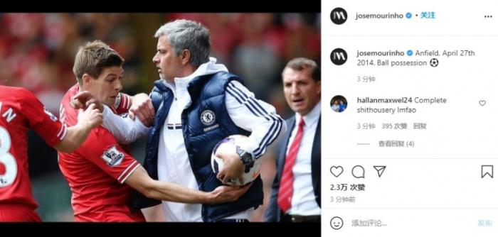 近日穆里尼奥在社交媒体上发布了消息,他晒出了自己在二度执教切尔西期间,带队对阵利物浦的比赛中,自己和杰拉德争抢时候的照片,随后还配文:2014年4月27日,安菲尔德球场,控球权!穆里尼奥为什么发布这个照片,不知道。为什么配文“控球权”也不知道。这也引起了许多媒体的猜测,不知道穆里尼奥到底怎么想的。