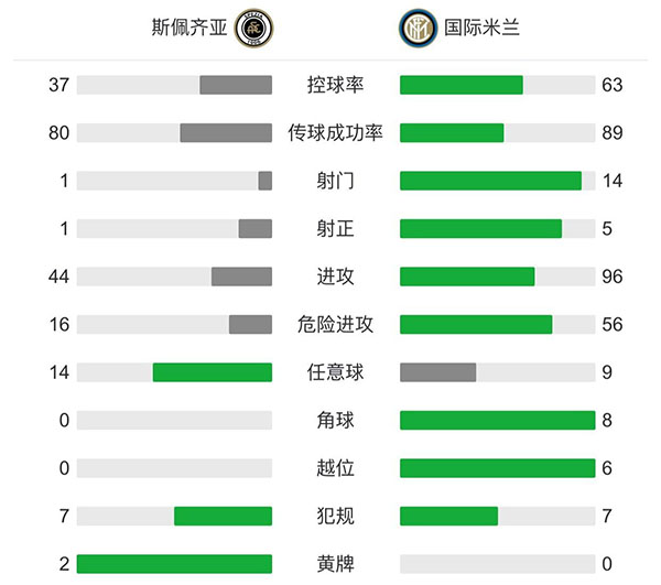 全场比赛结束,国际米兰客场1-1战平斯佩齐亚。