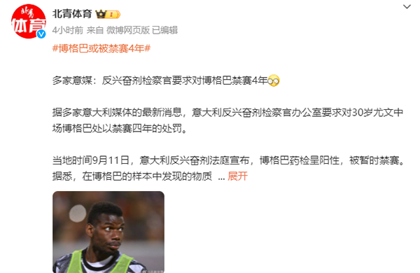 博格巴最初在8月20日与乌迪内斯的意甲联赛中被检测出阳性。当时,他体内的睾酮水平被发现升高,而10月份的 B 样本也呈阳性。