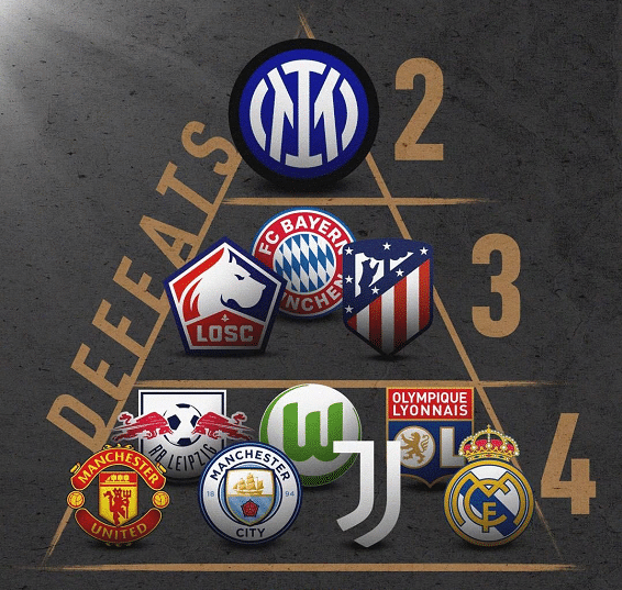 本赛季,在联赛赛场上国米是输球最少的球队,他们30轮比赛拿到了23胜5平2负的战绩,他们只输掉了2场比赛,说他们在塔尖没有任何问题。而第二档的是里尔、拜仁和马竞,其中里尔33场比赛拿到了20胜10平3负的战绩,仅仅输掉3场比赛。拜仁29场比赛21胜5平3负,也只输掉3场,而马竞30场比赛20胜7平3负,同样只输掉了3场。