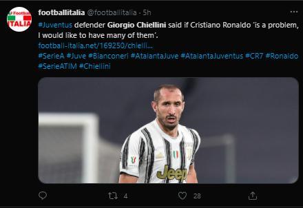 基耶利尼表示:“如果C罗是一个问题,我希望这种问题越多越好。”