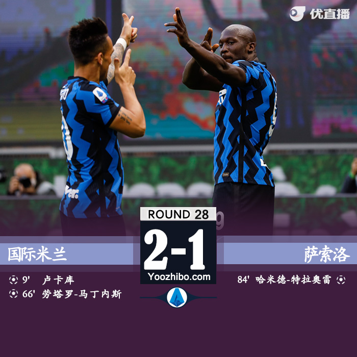 JRS直播网讯:北京时间4月8日00:45,意甲第28轮,国际米兰主场迎战萨索洛。上半场,奥比昂远射打偏,阿什利-扬助攻卢卡库头球破门,博加小角度打门被挡出。下半场,奥比昂远射被门将没收,卢卡库助攻劳塔罗破门,哈米德-特拉奥雷推射建功,最终,国米2-1萨索洛。