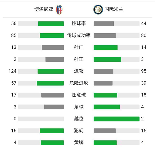全场比赛结束,国米客场1-0小胜博洛尼亚。