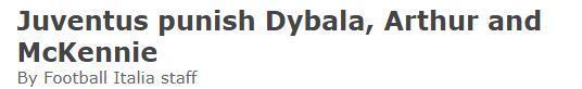 多家意媒今日表示,迪巴拉、麦肯尼和阿图尔三人将被处以罚款和队内禁赛一场的处罚,从而无缘都灵德比。