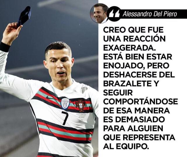 皮耶罗在节目中是这样说的:“我认为C罗的反应过激了,这种情况下生气是正常的,他可以和裁判交流,甚至进行抗议。但是将队长袖标丢掉并且继续发泄情绪就有些太过分了,因为C罗不仅仅是国家队队长,他还是葡萄牙足球最具标志性的人物。”