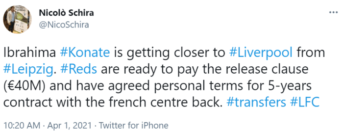 斯基拉表示:“科纳特已经越来越接近加盟利物浦了,利物浦准备好激活他合同中价值4000万欧元的解约金,并同意与这位法国中卫签约5年。”