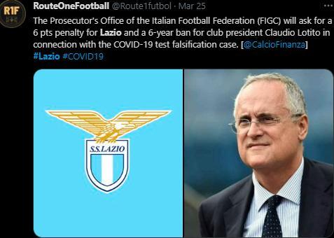 JRS直播网讯北京时间3月27日,据官方消息称,由于去年新冠病毒检测结果反复事件,拉齐奥主席洛蒂托将被禁止参与足球活动7个月,队医Fabio Rodia和Ivo Pulcini也同时被禁止在未来12个月参与足球活动,拉齐奥俱乐部也将收到15万欧元的处罚。
