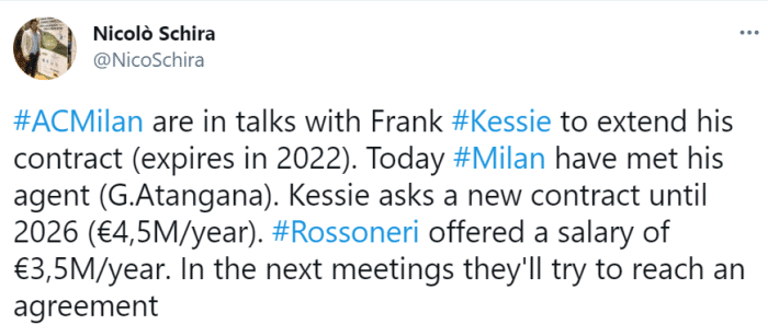 目前,他与米兰的合同将在2022年6月到期,俱乐部也迫切希望与这名科特迪瓦国脚续约。