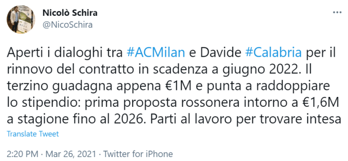 JRS直播网3月26日讯 据意大利记者尼科洛-斯基拉报道,米兰已为卡拉布里亚开出首份续约合同,他们给出的条件是160万欧元年薪,合同期限至2026年。
